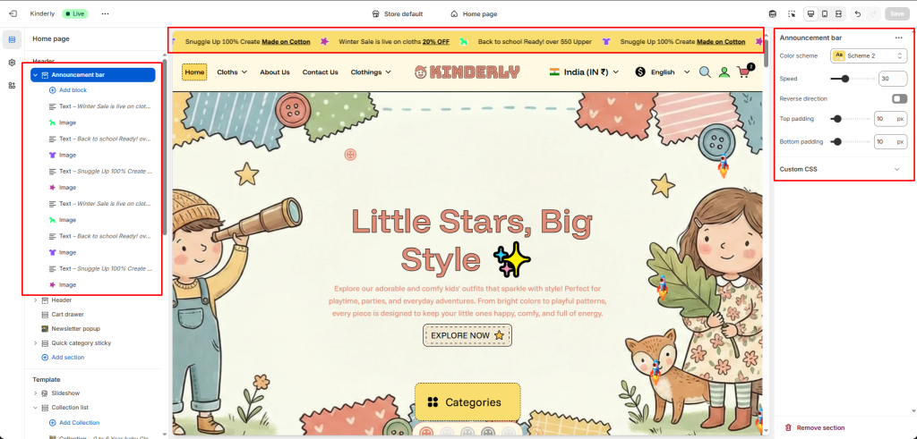 The Announcement Bar section allows you to display rotating or static messages at the top of your store. This is useful for sharing important announcements, promotions, shipping updates, or seasonal messages.
