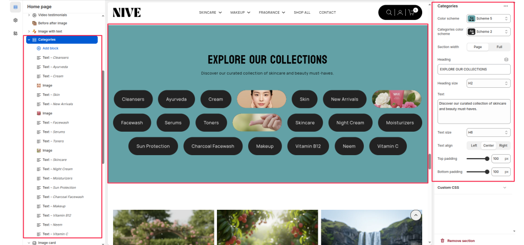 The Categories section allows merchants to showcase product categories or collections in a visually engaging, tag-style layout with optional images. This section is ideal for highlighting skincare, beauty, fashion, or any grouped product categories on the homepage.