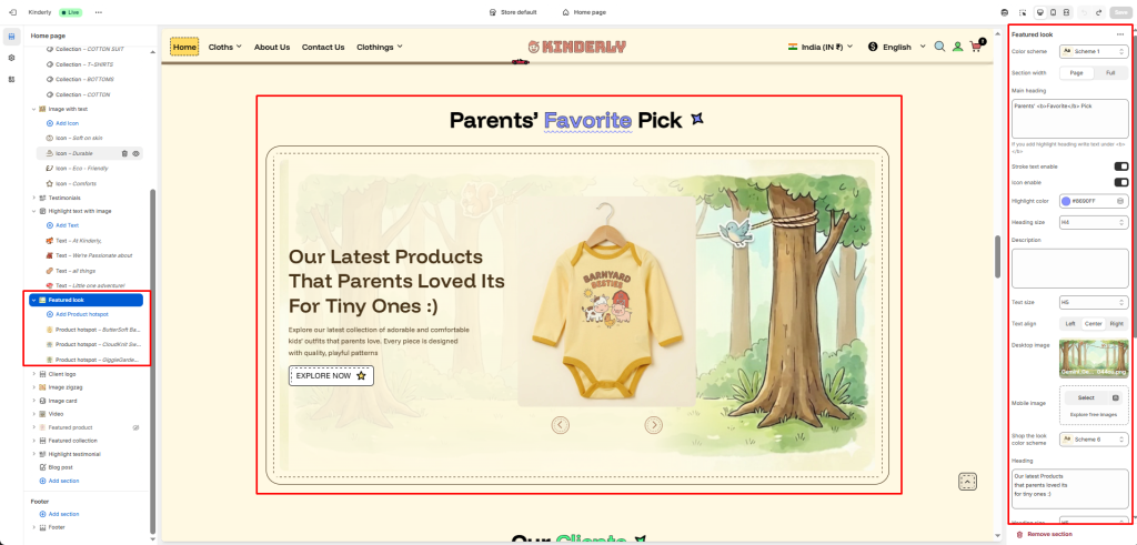The Featured Look section displays a lifestyle image with product hotspots alongside a content panel — combining storytelling with interactive product discovery.