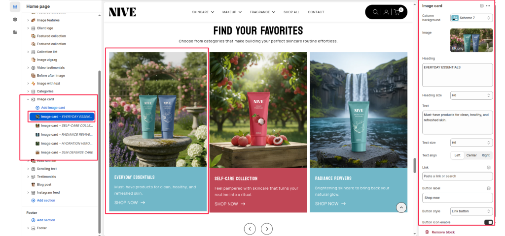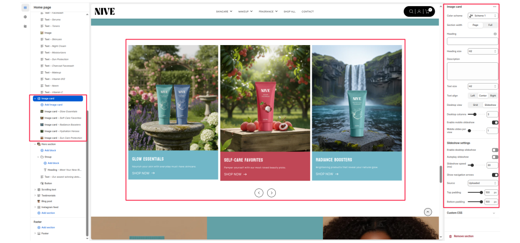 The Image Card section allows merchants to showcase multiple promotional image blocks in either a grid layout or a slideshow layout. Each card can display an image, title, description, and call-to-action button. This section is ideal for highlighting featured categories, collections, or brand stories.