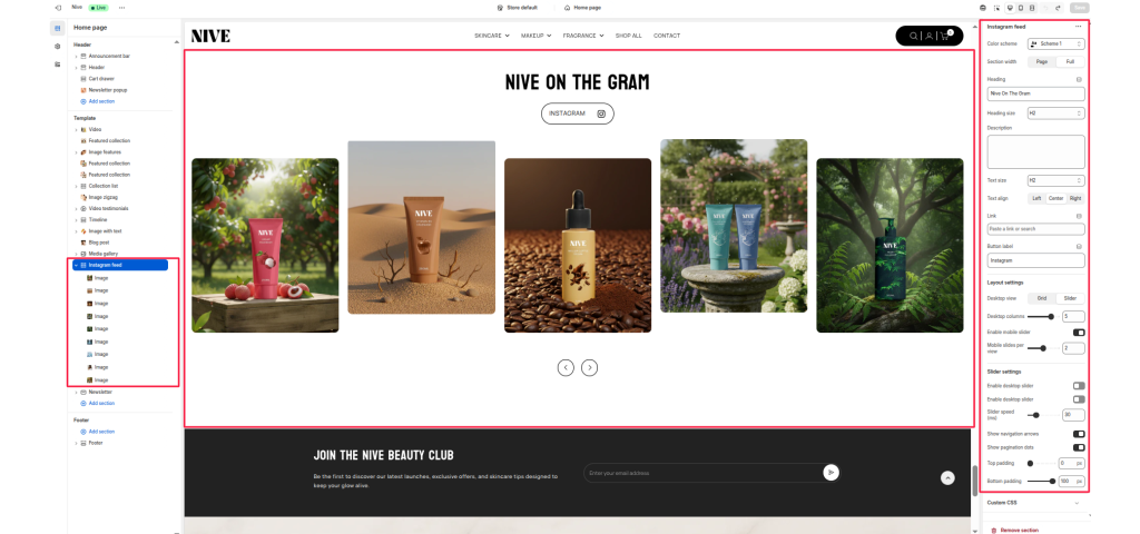 The Instagram Feed section is designed to showcase your brand’s social media presence directly on your store, helping to strengthen engagement and brand storytelling. This section displays a customizable grid or slider of images that mimic your Instagram posts, encouraging visitors to follow your brand and explore more content.