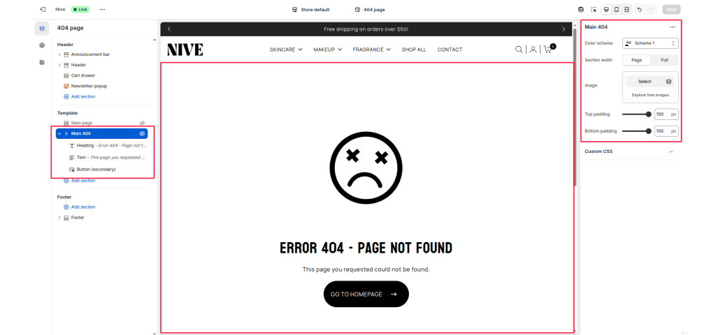The Main 404 section is used on the “404 Error” page of the Shopify theme.