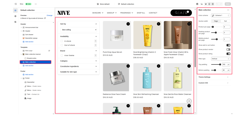 The Main Collection section displays a collection of products on the collection page. It supports product filtering, sorting, grid configuration, and adjustable layouts for both desktop and mobile. The section adapts to your theme’s design using the selected color scheme and padding options.