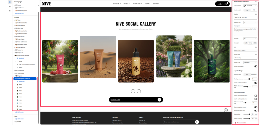 The Media gallery slideshow section is designed to showcase your brand’s social media presence directly on your store, helping to strengthen engagement and brand storytelling. This section displays a customizable grid or slider of images that mimic your Instagram posts, encouraging visitors to follow your brand and explore more content.