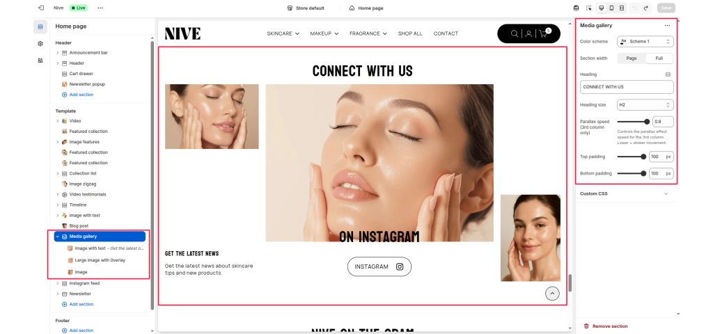 The Media Gallery section is designed to display a collection of images or media content in a visually dynamic grid layout. It’s ideal for showcasing lifestyle photography, brand highlights, product moments, or social media content — helping to create a more immersive storytelling experience.