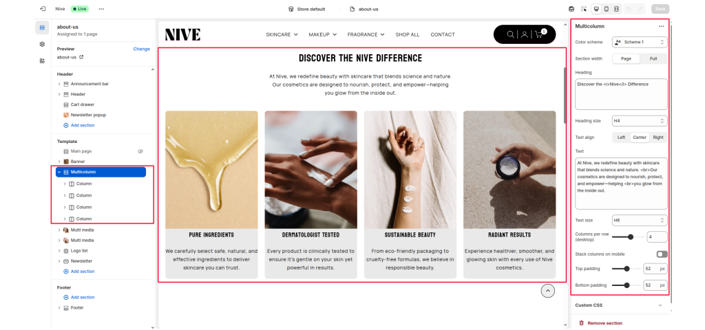 Each column supports an image, title, text, and optional link, giving merchants flexible control over how content is presented.