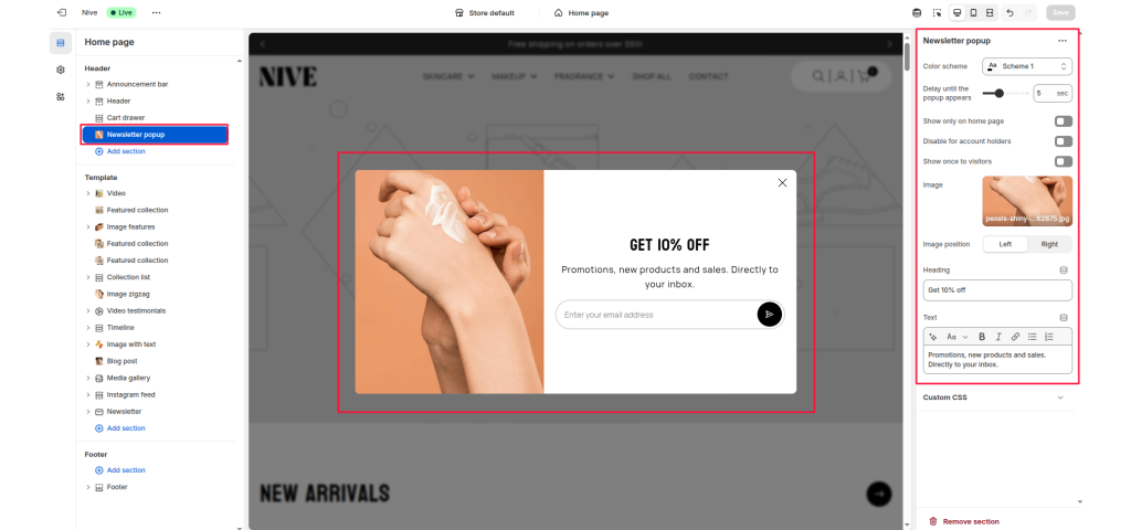 The Newsletter Popup section allows you to capture customer emails and grow your subscriber list with a stylish, customizable popup. It can display promotional messages such as discounts or announcements and appear automatically after a set delay when a visitor lands on your store.