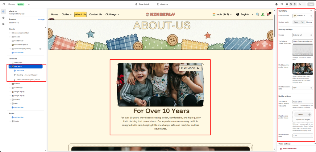 The Our Story section displays a video with a heading and text below it, designed for brand storytelling on pages like About Us.