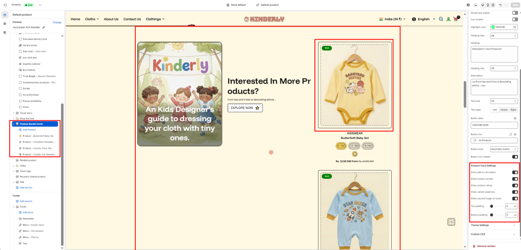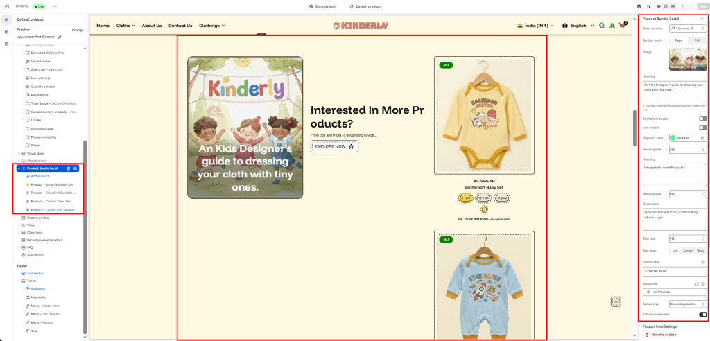 The Product Bundle Scroll section displays a two-column layout with a promotional content panel on the left and a vertically scrolling list of product cards on the right — great for upselling or cross-selling related products.