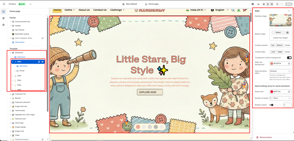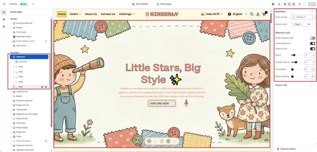 The Slideshow section displays a full-width hero banner with multiple slides, each supporting images, content blocks, and unique animation effects.
